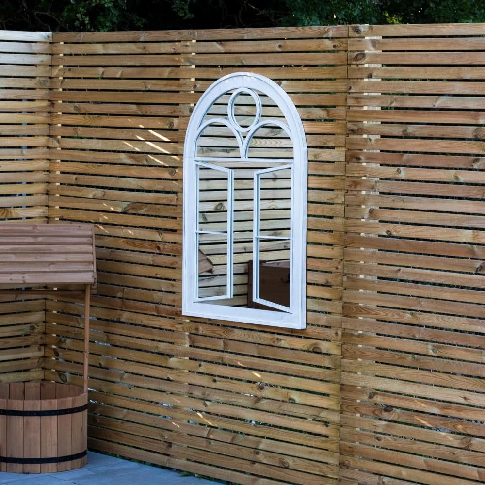 - STYLISH – The Acton large white metal garden arch mirror has a lovely traditional design that will create a stand out attraction in your garden. You can also use the mirror indoors. PLEASE NOTE: The white frame has a rustic/worn finish