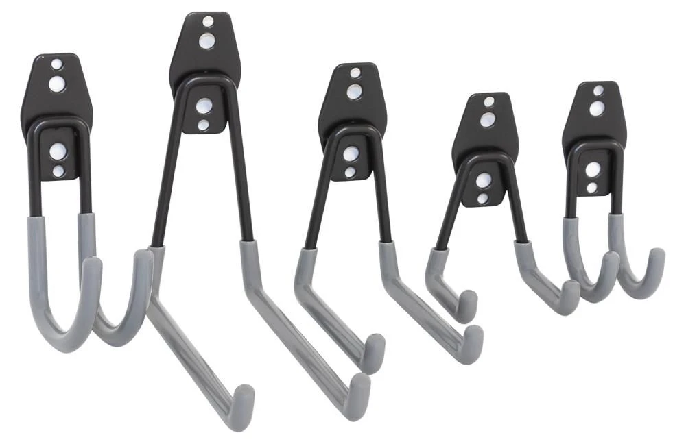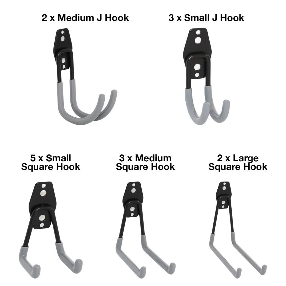 - PACK OF 15 – 5 different styles/sizes and 15 in total. Perfect for the numerous uses around your garage or workshop. Included in the set is 2 x Large Square Hooks, 3 x Medium Square Hooks, 5 x Small Square Hooks, 2 x Medium J Hooks, 3 x Small J Hooks