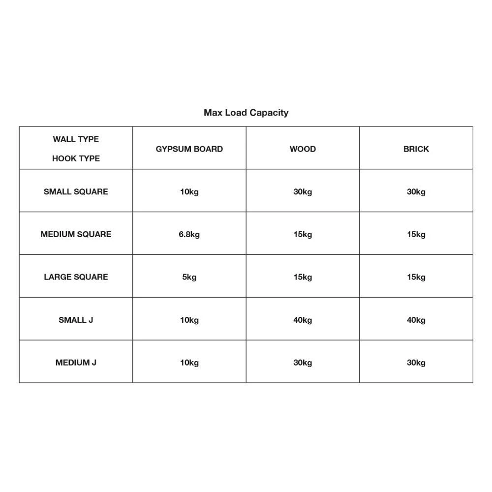 - STRONG LOAD CAPACITY – These hooks have a high max load making them perfect for hanging a multitude of items. The load capacity ranges from 5kg to 40kg depending on the hook shape and size and the wall type (see image for details)